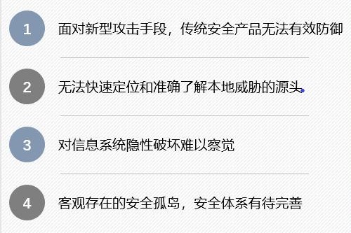 高级持续性威胁APT (Advanced Persistent Threat) , 是利用先进的攻击手段对特定目标进行长期持续性网络攻击的一种攻击形式。此攻击会主动挖掘被攻击对象受信系统和应用程序的漏洞,并利用新型的网络攻击手段进行攻击。传统依靠已知特征来检测的IDS和IPS防御模式,对现行的APT攻击行为将无能为力。