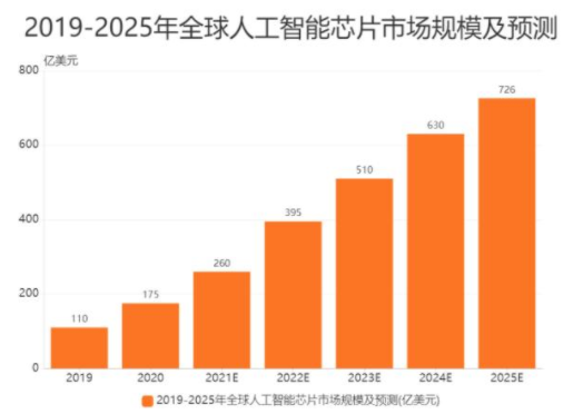 根据Tractica报告,2020年全球人工智能芯片市场规模已经达到175亿美元,而21年将提高将近50%,达到260亿美元。2025年提高到了726亿美元,几乎每年翻一倍的速度在增长。