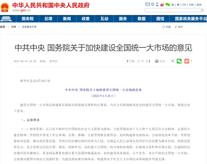 《中共中央国务院关于加快建设全国统一大市场的意见》正式发布,为建设全国统一大市场作出部署。