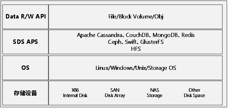 从图中的框架来看,首先需要明确的是SDS并不是某一款具体的存储产品,而是一个技术框架,一种技术理念。从下往上,共有四个层次:存储设备层是最底层的数据存储物理载体,在这种框架下,对物理存储载体的要求空前放宽,任何性能、任何形态、任何容量、任何连接都可以接受。只要他们具备一个条件即可,那就是可以被上层操作系统识别为可用存储介质,可以定义为上层操作系统的可用设备。操作系统层承载着两方面的作用,一方面需要识别到底层可用的存储设备,另外一方面要提供软件运行的环境。SDS APS也就是存储软件层,无论是什么样的存储软件,它只是作为操作系统环境运行的一个软件,其特殊之处在于它可以将系统识别到的存储设备进行整合并以应用可以操作的接口提供给应用。最上层的Data RW API,也就是数据的读写接口,它可以按照应用可以读写的数据库语言接口方式、数据文件方式或者是普通的文件系统、对象接口、Block存储接口等方式提供给应用程序所用。