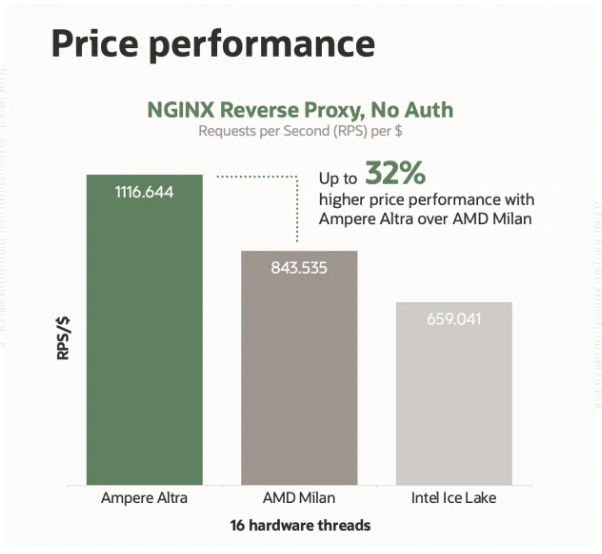 2021年,Oracle云也推出了基于Ampere Altra的A1实例,性价比相比较于AMD的米兰都高出了32%。