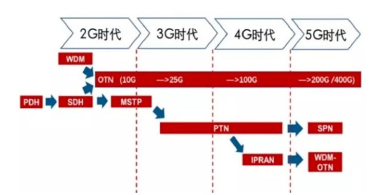一般我们说到承载网,是指基站和核心网各网元之间的组网。手机通过空口接入基站,基站通过光纤、交换机,和核心网各网元进行组网,最后通过核心路由器,汇入互联网。如图1所示。从2G时代到5G时代,承载网技术在不断演进,如图2所示。