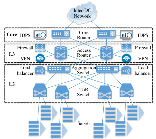 聊完运营商的承载网,再来看看数据中心(DC)网络。在这两种网络的组网拓扑中,都可以分为接入层、汇聚层、核心层,只是DC网络的演进更为剧烈。如图5所示。