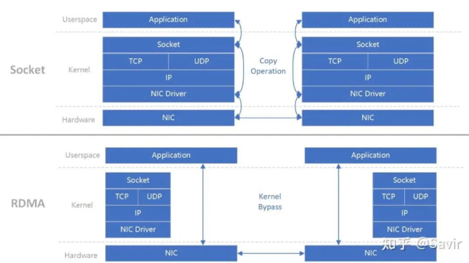 这里说一下,RDMA和TCP/IP是并列或者说竞争关系,TCP/IP的优点是生态繁荣、稳定,缺点是软件参与过多,准确说是内核协议栈,所以延迟很大。SmartNIC中,会通过硬件offload一部分TCP/IP软件开销,但TCP/IP协议栈的设计理念和实现复杂度,就不是为了硬件设计的。