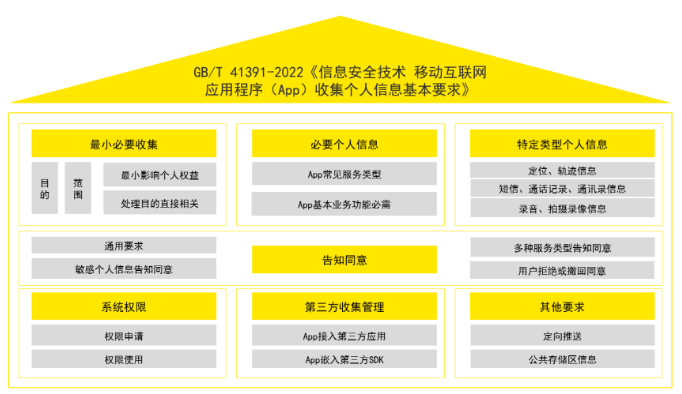 《App收集个人信息基本要求》分别明晰了收集个人信息、必要个人信息的基本规定,包含告知用户同意、获取系统权限及第三方收集管理等要求。在现有监管要求、行业标准的基础上,通过附录等形式明确各常见服务类型App必要个人信息范围、可收集个人信息权限范围、常见服务类型与系统权限相关程度等,为实际的管控提供了参考标准。
