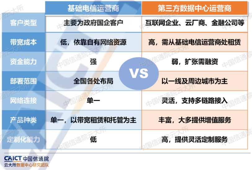 《报告》指出,与基础电信运营商对比,第三方数据中心运营商有着如下差异: